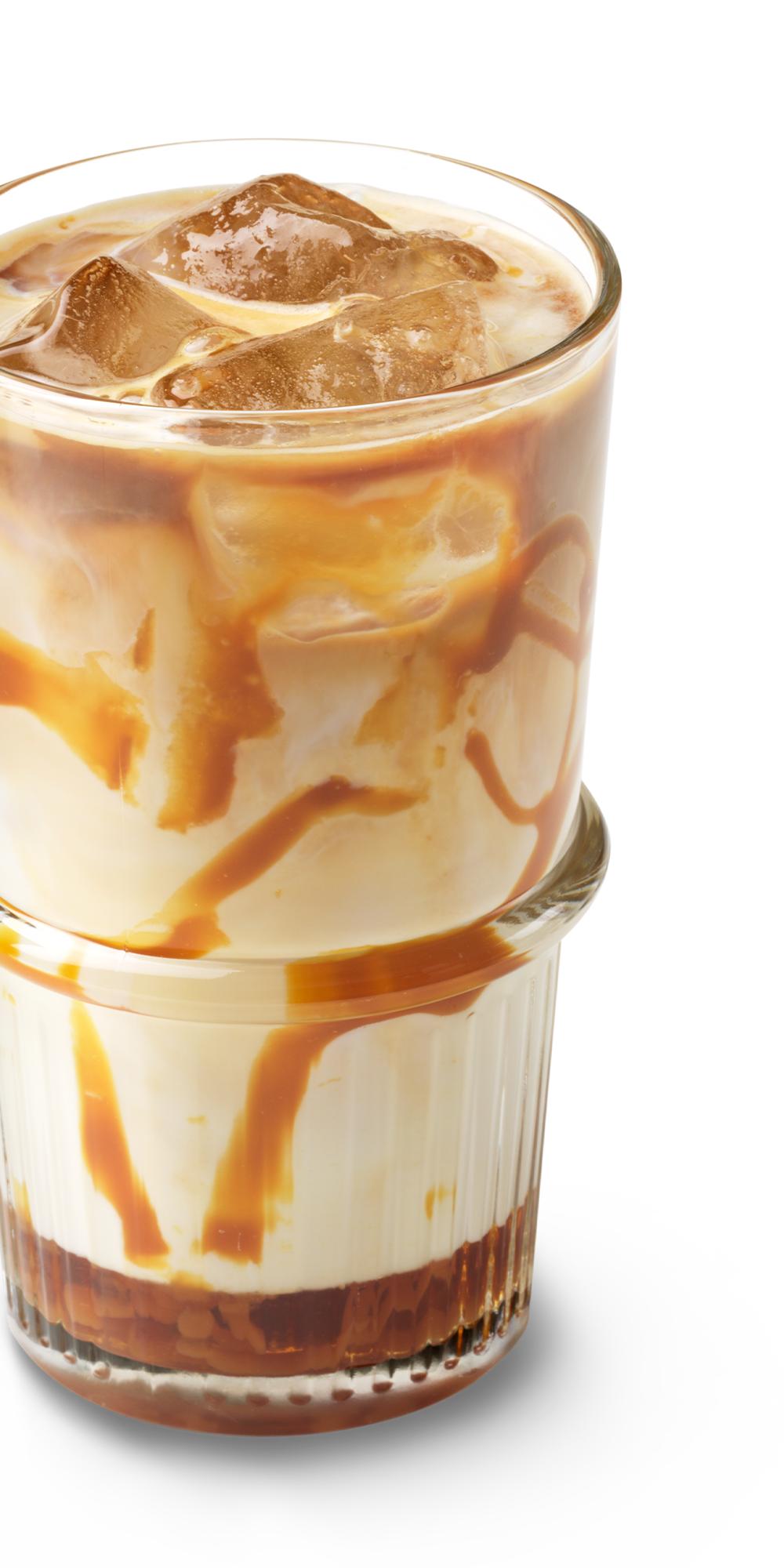Espressopohjainen kylmä kahvijuoma, joka vie kielen mennessään, vaikka haluaisit ottaa ihan coolisti. Espressoa, maitoa, jäitä, salted caramel -siirappia ja karamellikastiketta.